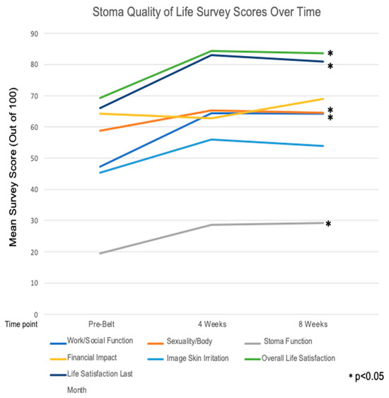 Overall, 37 patients completed the pre-belt survey, 4-week survey, and 8-week survey and were included in the repeated measures ANOVA analysis. Mean scores for QOL measures at each time point can be visualized in Table 2 and Figure 3. On repeated measures ANOVA, a significant increase in QOL scores was seen between the time points on overall life satisfaction (F(2, 76) = 14.77, p < 0.001) and in the domains of work/social function (F(2, 72) = 30.32, p < 0.001), sexuality/body image (F(2, 68) = 3.34, p = 0.04), and stoma function (F(2, 72) = 8.72, p < 0.001). No significant differences between time points were observed in the domains of financial impact (F (2, 72) = 0.52, p = 0.60) and skin irritation (F(2, 74) = 2.37, p = 0.10). Mauchly’s Test of Sphericity indicated that the assumption of sphericity had not been violated for any of the measures.