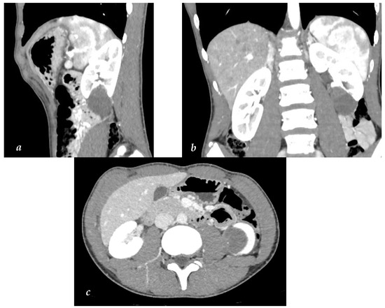 (a–c) Abdominal CT images. (a) Sagittal view of the cleavage plane between the cyst and renal parenchyma conceivable. (b) Coronal view of tumor relationships with adjacent organs. (c) Transverse view with no signs of invasion of the surrounding organs.