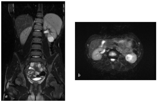 (a,b) Abdominal MRI: the coronal and transverse views exhibiting the tumor position and excluded lymph node localization.