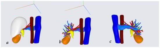 (a–c) Virtual 3D reconstruction. (a) Posterior view; (b) posterior view where kidney is excluded; (c) anterior view of tumor. Legend: tumor = orange, kidney = white, arterial vessels and aorta = red, venal vessels and vein cava = blue.
