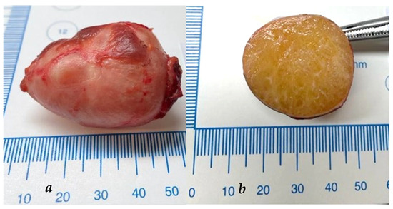 (a,b) The enucleated tumor. (a) The tumor exhibits a well-respected pseudo capsule; (b) the yellowish homogeneous content after the sagittal section.