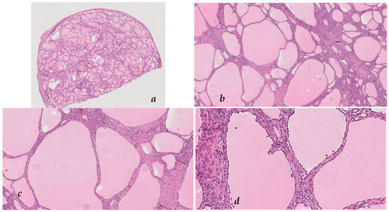 (a–d) Histopathology images. Cuboidal and columnar cells (c,d) in a fibrotic stroma with cysts and small tubules (a–d). The cells have few mitotic figures but prominent nucleoli (d). We offer different levels of magnification to better appreciate these characteristics: (a) 10×; (b) 40×; (c) 80×; (d) 100×.