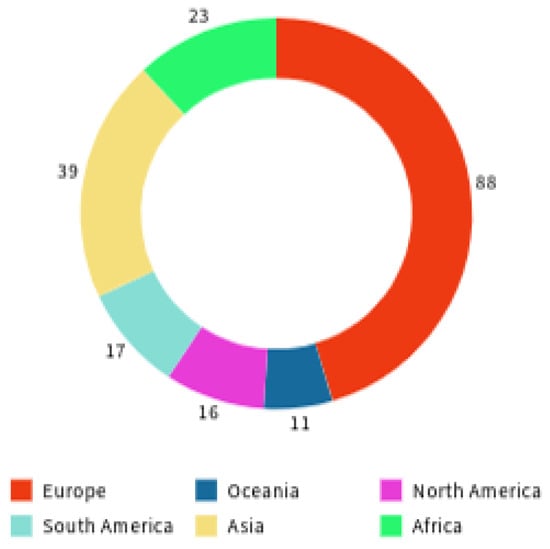 Distribution of survey respondents by continent. Countries represented with at least five respondents included Australia, France, Spain, Canada, India, Czech Republic, Italy, Egypt, Mexico, Argentina, Belgium, Brazil, Chile, Colombia, Dominican Republic, Germany, Israel, Maldives, Morocco, New Zealand, Panama, Peru, Portugal, Saudi Arabia, USA, and Yemen.