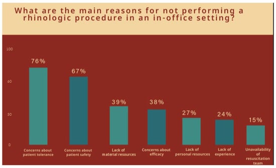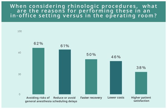 Participants in this study had varied experience levels and practice settings [1,19,20], commonly performing nasal polypectomy and turbinate reduction/turbinoplasty. Many had residents or trainees involved in these procedures. Key concerns for IORPs were patient tolerance and procedure safety. Benefits include avoiding general anesthesia, reducing surgical wait times, lowering costs, and speeding up recovery [21,22,23,24]. Ensuring respectful staff communication is crucial for minimizing patient anxiety.