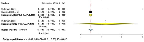 | Agarwal et al., 2020 [11] | 2020 | Prospective observational cohort study | India | Laparoscopic sleeve gastrectomy, Roux-en-Y gastric bypass (RYGB), and anastomosis gastric bypass (OAGB) | 39.9 ± 11.2 | 58 | 58 | 17 (29.3) | 41 (70.7) |