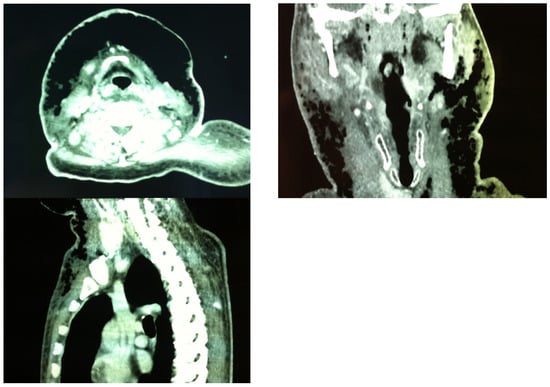 - Becker, M.; Zbären, P.; Hermans, R.; Becker, C.D.; Marchal, F.; Kurt, A.M.; Marré, S.; A Rüfenacht, D.; Terrier, F. Necrotizing fasciitis of the head and neck: Role of CT in diagnosis and management. Radiology 1997, 202, 471–476. [Google Scholar] [CrossRef] [PubMed]