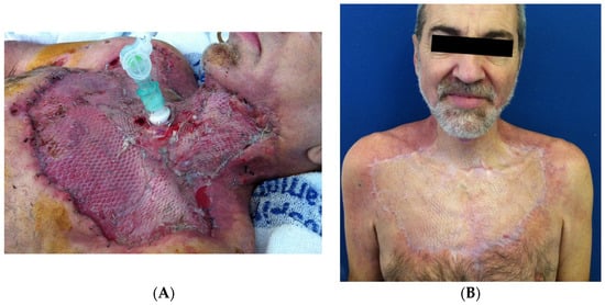 Patient A. (A) Split-thickness skin grafts were harvested to reconstruct the defect 39 days after first surgery. (B) Outcome 6 months after reconstruction. This clinical case was published in Int. J. Oral Maxillofac. Surg., 42, Leyva P., Herrero M., Eslava J.M., Acero J. [32].