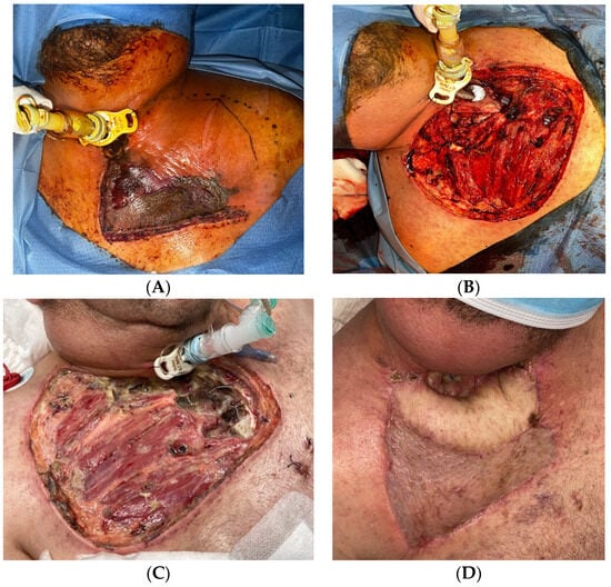 Patient A. (A) Necrotizing fasciitis of odontogenic origin in a 51-year-old male with undiagnosed diabetes mellitus and smoker of 30 cigarettes/day. He received treatment at home with amoxicillin/clavulanic acid and ibuprofen and only consulted once the disease had seriously progressed. He presented a poor general status with submandibular swelling and erythema extending to the clavicles and subcutaneous crepitus in the anterior aspect of the neck and supraclavicular region. He was febrile (37°), tachycardic, and hypotensive. The white blood cell count was 14.8 per mm3, creatinine 2.29 mg/dL, urea 170 mg/dL, sodium 121 mmol/L, and glucose > 800 mg/dL. Surgery was performed within 5 h from admission. No necrotic skin was present on admission nor after the first surgery. Therefore, a conservative approach was chosen initially, with drainage and irrigation of the tissues. He was transferred to the intensive care unit after surgery. His condition worsened to septic shock with acute renal failure and diabetic ketoacidosis. (B) Twelve hours after surgical exploration and drainage, skin necrosis appeared, and the patient was taken back to surgery. Three more surgeries with extensive debridement of all necrotic tissue were performed. Necrotizing fasciitis was histopathologically confirmed and Streptococcus sp. and Candida albicans were isolated. This clinical case was previously published in Int. J. Oral Maxillofac. Surg., 42, Leyva P., Herrero M., Eslava J.M., Acero J. [30].