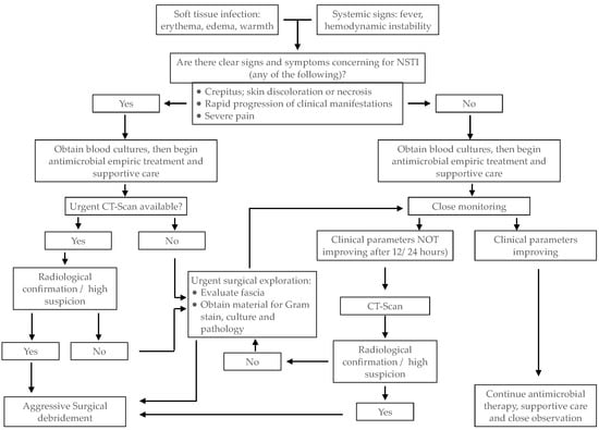- Pelletier, J.; Gottlieb, M.; Long, B.; Perkins, J.C. Necrotizing Soft Tissue Infections (NSTI): Pearls and Pitfalls for the Emergency Clinician. J. Emerg. Med. 2022, 62, 480–491. [Google Scholar] [CrossRef] [PubMed]
