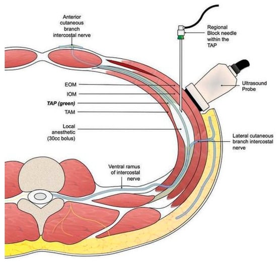 - Karim, H.M.R.; Bhakta, P.; O’Brien, B.; Vassallo, M.C. Bilateral subcostal transversus abdominis plane block as a component of multimodal analgesia. Eur. J. Anaesthesiol. 2020, 37, 58–59. [Google Scholar] [CrossRef] [PubMed]