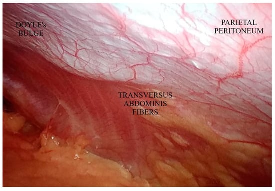 Laparoscopic view of Doyle’s bulge, demonstrating the infiltration of local anaesthetic into the plane between the transversus abdominus and internal oblique [6].