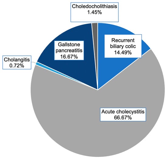 The most common indication for an emergency LC was acute cholecystitis (n = 92, 66.7%), followed by symptomatic recurrent biliary colic (n = 20, 14.5%), and the least common indication was cholangitis, with one patient (0.72%) undergoing an LC. Figure 3 demonstrates all indications for surgery. An infraumbilical 12 mm port entry was the most common approach used (n = 90, 65.2%); two patients had a 5 mm optical entry due to prior surgery (1.4%), and one had an open cutdown to the right paramedian also due to prior surgery (0.72%). The average time from ED presentation to theatre (surgical start time) was 46 h (1.9 days). These patients were triaged as “Category C” on the emergency board to be completed within 24 h. Average postoperative length of stay (LOS) in the LA group was 1.26 days, compared to an LOS in the TAP/RS group of 1.08 days (p = 0.11). Ten patients in the LA cohort raised concerns at the time of their postoperative phone call regarding postoperative wound issues, compared to four patients in the TAP/RS cohort. Of the whole cohort, 18 patients (13.0%) were lost to follow-up. The operative data within each cohort are demonstrated in Table 2.