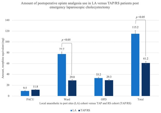 There was less opiate analgesia use in patients in the ward who had received a TAP and RS block, with an average of 29 mg (morphine equivalent), compared to 77.7 mg (morphine equivalent) in the LA group; however, this difference was not statistically significant (p = 0.13).