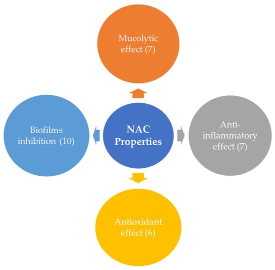 The NAC therapeutic activity, as described by Raghu et al., has been analyzed for more than 50 years so far [7]: its clinical benefits as a mucolytic and mucoregulator agent were first described in patients with cystic fibrosis in the 1960s and, in the 1970s, NAC was first used to treat paracetamol overdose, thanks to its prompt ability to replace intracellular GSH, thus avoiding acute hepatotoxicity. NAC has a clearly established safety record and it is already considered a therapeutic option for conditions with abnormal, thick or sticky mucus secretions such as pneumonia, bronchitis, chronic obstructive pulmonary disease (COPD), cystic fibrosis (CF) and idiopathic pulmonary fibrosis (IPF). It also has a powerful anti-inflammatory effect in endotoxemia, reducing tumor necrosis factor-alpha (TNF-α) and interleukins (IL-1β, IL-6, IL-8) production, suppressing the activity of NF-κB and enhancing oxygen extraction in kidney and gastrointestinal diseases, psychiatric illnesses and neurodegenerative conditions [7,8,9]. As demonstrated by Dinicola et al. [10], NAC has a fundamental role as an adjuvant molecule in treating bacterial biofilms, with an excellent efficacy and safety profile. Therefore, combined with several antibiotics, NAC has demonstrated to promote their permeability to the biofilm’s deepest layers, overcoming the resistance to the classic antibacterial approach.