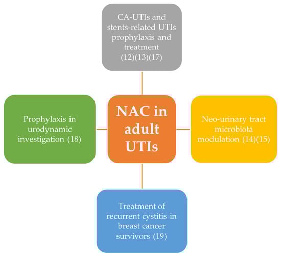 Current NAC applications in treating and preventing UTIs in adult patients: prophylaxis during urodynamic investigations, reducing the risk of infections during bladder function tests; preventing and treating CA-UTIs and stents-related UTIs, decreasing the incidence of infections linked to catheters and stents by inhibiting biofilm formation; modulating neo-urinary tract microbiota, balancing the urinary tract microorganisms to prevent infections; and treating recurrent cystitis in breast cancer survivors, improving quality of life by reducing infection recurrence and urogenital discomfort.