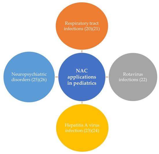 NAC is already used as a therapeutic and prophylaxis option in the pediatric field, showing an excellent tolerability profile. Its principal applications in pediatrics are illustrated in Figure 3.