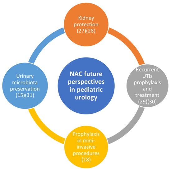 NAC potential future perspectives in pediatric urology. NAC provides significant kidney protection, improving renal function after bilateral ureteral obstruction and reducing the progression of chronic kidney disease. In treating recurrent UTIs, especially in young girls and adolescents, NAC could offer a novel approach by reducing bacterial adherence and colonization in the urinary tract, thus lowering antibiotic resistance risks. Additionally, NAC might serve as a prophylactic alternative to antibiotics in mini-invasive urological procedures, preventing antibiotic-associated side effects. Its role in preserving urinary microbiota homeostasis further underscores its potential to maintain long-term urinary health in children.