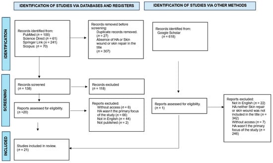 We accessed and selected manuscripts from five databases, PubMed, Scopus (Elsevier), Science Direct, Springer Link, and Google Scholar, without temporal restrictions regarding the year of publication and using the following keywords: “hydroxyapatite AND skin AND wound”, “hydroxyapatite AND skin repair”, and “hydroxyapatite and/or burn wound treatment”. Through the intersection of these keywords, we conducted a detailed analysis of the results, considering the title and abstract of each scientific article as important criteria for selection. Each manuscript was analyzed to ensure the relevance of both the title and abstract. Subsequently, the manuscripts were classified as included or not included according to the established eligibility criteria. In selecting studies for a detailed analysis, two independent reviewers evaluated the manuscripts, considering the selection criteria to minimize bias.