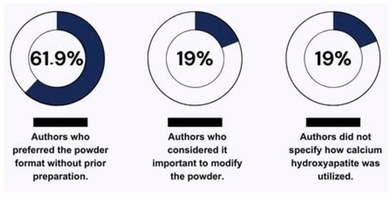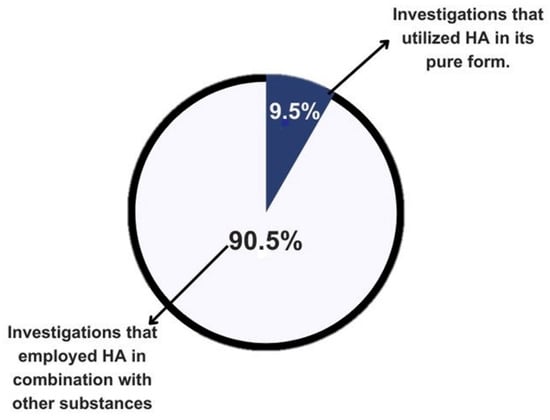 According to the findings of this review, the most commonly used form of HA in the presented literature was powder, without prior preparation, with 61.9% of the authors preferring its use in this format [2,19,26,30,32,34,35,36]. Meanwhile, 19% of the authors considered it important to modify the powder or prepare it before the experiment to facilitate handling of the material according to the application of each study [12,28,29] (Figure 3). This divergence in preparation leads to a lack of standardization in study methods, which could hinder future studies when making direct comparisons of the results [53].