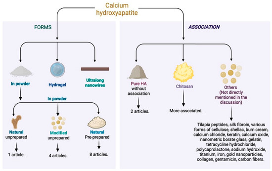 The combination of these materials results in antibacterial efficacy and cytocompatibility, accelerating the healing of burns and other skin wounds. In addition to the use of hydroxyapatite, combinations were explored to enhance the action of chitosan. In one study, more promising results were obtained by combining chitosan, hydroxyapatite nanorods, and titanium (Ti) [35]. Another approach involved the incorporation of nano-hydroxyapatite and tetracycline hydrochloride into the polyelectrolyte complex nanofibers of chitosan [34], providing prolonged drug release effects.