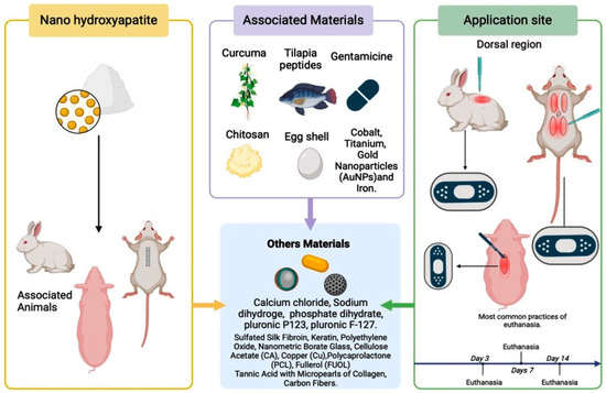 The literature review opened a window of possibilities regarding the application sites and the preference for specific animal models, leading to a study of the various contexts in which these animals were chosen and used. The studies predominantly used rats as experimental models [19,33,34,38,40] and mice [27,29,30]. These rodent species are preferred due to their genetic similarity to humans, availability, and cost-effectiveness [58]. However, extrapolating the results from animal models to humans should be performed with caution, considering the significant physiological differences [59].