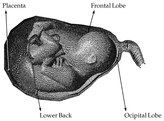 The geometrical model employed in the study is a digital representation of the maternal–fetal anatomy (Figure 1), derived from clinical imaging data. It consists of three primary components: the uterus, the amniotic sac, and the fetus. The amniotic sac is modeled as a fluid-filled, compliant membrane encasing the fetus, allowing for both the movement of the fetus and the dynamic response of the amniotic fluid during a traumatic event. The fetus itself is constructed with a high degree of anatomical accuracy, reflecting the size, shape, and position within the amniotic sac according to gestational age. The fetus is in a head-down (cephalic) position. This is reflective of the typical fetal position during the later stages of pregnancy, specifically during the third trimester. This positioning is crucial as it significantly influences the dynamics of maternal traumas and their potential impact on the fetus. To accurately capture the interactions between the amniotic fluid and the fetus during traumas, the model integrates the physical properties of the amniotic fluid, fetal tissue, and the sac’s membrane. Advanced computational simulations are then conducted to analyze the forces and pressures acting on the fetus as a result of maternal traumas and how these stresses might contribute to potential developmental abnormalities.