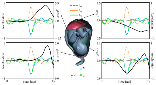 In Figure 3, the colored lines represent the acceleration measurements obtained experimentally. The acquired experimental values are applied to the uterine model depicted in Figure 1. Subsequently, calculations are conducted using the IMPETUS Afea software (Engine v8.1.603) described above. In addition, Figure 3 provides a detailed representation of the relative displacement of the fetus/placenta in relation to the uterus during the type of movement typically observed in traumatic events. The graph displays normalized distances between the fetus/placenta and the uterus at four distinct points over a period of time. These measurements have been standardized based on their initial values prior to the onset of trauma (T = 0 ms). When the values surpass one, it indicates an expansion in the separation between the fetus/placenta and the uterus, while a value below one signifies a contraction in distance. Despite the manifestation of oscillatory acceleration patterns (also represented in the graphs), the variations in the distances between the fetus/placenta and the uterus remain relatively minor, a phenomenon attributed to the cushioning effect of the amniotic fluid.