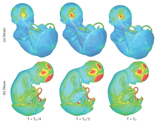 Succinctly speaking, the strain experienced by the fetus in response to external loads can be considered a form of deformation. Deformation refers to the change in the shape of an object in response to applied forces. In the case of the fetus, the strain distribution and behavior can be influenced by various factors, including the position of the fetus, the elasticity of the fetal tissues, the mechanical properties of the uterine environment, and the presence of amniotic fluid. Maternal exposure to external loading can induce sudden and intense movements in the uterus, leading to changes in the strain distribution on the surface of the fetus. These changes in strain can affect the fetal tissues and organs, potentially leading to adverse effects on fetal development. Figure 4a shows strain values on the fetus at three different time points. It can be seen that the maximum values are located on the frontal lobe of the fetus.