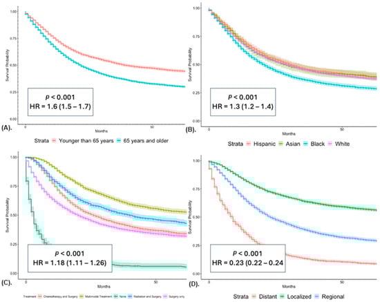 The 1-year and 5-year OS rates were better for patients younger than 65 years than for patients older than 65 years (1-year OS 73.4% vs. 65.0%, 5-year OS 44.8% vs. 30.5%) (Figure 2A; Supplemental Table S2). The 1-year and 5-year overall survival (OS) rates differed significantly by race. Hispanics with a 1-year OS of 72.1% (95% CI, 69.6–74.7%) and a 5-year OS of 39.4% (95% CI, 36.5–42.5%), Asians with a 1-year OS of 70.7% (95% CI, 67.6–73.9%) and a 5-year OS of 39.5% (95% CI, 36.0–43.4%), and Whites with a 1-year OS of 69.1% (95% CI, 68.0–70.3%) and a 5-year OS of 37.9% (95% CI, 36.7–39.2%) all had better survival outcomes than Black patients, who had a 1-year OS of 63.9% (95% CI, 61.9–65.9%) and a 5-year OS of 29.1% (95% CI, 27.2–31.2%) (Figure 2B and Supplemental Table S3). The 1-year survival rate with multimodal therapy was 88.2% (87.0–89.5%), and at 5 years, it was 52.8% (50.7–55.1%) (Figure 2C). Univariate analysis revealed that race was a significant prognostic factor, with Black patients having a worse prognosis (hazard ratio (HR) = 1.3 (95% CI, 1.2–1.4; p < 0.001)) (Table 2).