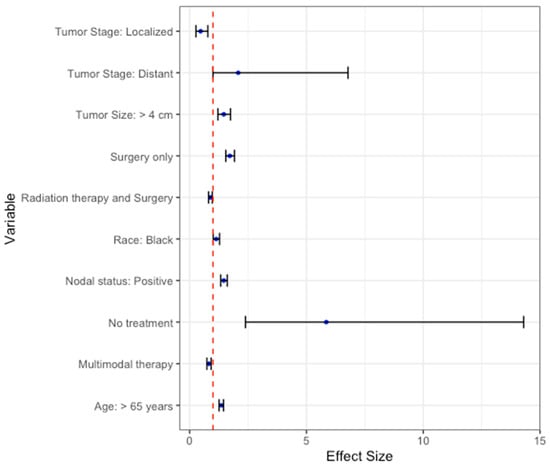 Multivariate analysis was performed using Cox survival regression analysis (Table 2). Independent factors associated with increased mortality were identified as age above 65 years (H. R = 1.36 (95% CI, 1.26–1.45); p < 0.001), Black race (H. R = 1.14 (95% CI, 1.01–1.28); p = 0.03), a tumor size greater than 4 cm (H. R = 1.46 (95% CI, 1.21–1.75); p < 0.001), positive nodal status (H. R = 1.46 (95% CI, 1.33–1.61); p < 0.001), and patients receiving either no treatment (H. R = 5.85 (95% CI, 2.39–14.30); p < 0.001) or surgery only (H. R = 1.72 (95% CI, 1.55–1.92); p < 0.001). The factors that were associated with decreased mortality were localized tumors (H. R = 1.46 (95% CI, 1.21–1.75); p < 0.001) and receiving multimodal treatment (H. R = 0.82 (95% CI, 0.74–0.92); p < 0.001) or radiation combined with surgery (H. R = 0.89 (95% CI, 0.81–0.97); p < 0.001). A hazard ratio above 1 indicates that there is a higher incidence of mortality in the pertaining group, whereas a hazard ratio below 1 indicates a decreased incidence of mortality. All statistically significant hazard ratio coefficients are displayed graphically in the forest plot (Figure 3).