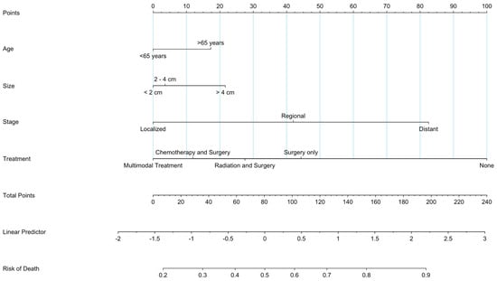 To create a predictive measure that could predict the survival of patients with uterine carcinosarcoma, a prognostic nomogram was created to measure patient survival using the factors of age and treatment. The nomogram visually represents the predictive model by assigning a numerical score to each variable based on its relative contribution to the overall prognosis. These scores are then summed to generate a total point value, which correlates with the predicted probability or risk of the defined outcome, which is overall survival (OS). The prognostic nomogram showed increased mortality for older patients. In addition, the prognostic nomogram predicted increased mortality for patients with tumors greater than 4 cm in size. Distant metastases were associated with a significantly increased probability of death, whereas regional metastases were associated with a moderate increase in mortality. The prognostic nomogram revealed a significant increase in mortality probability for patients who received no treatment and a decrease in mortality for patients who received multimodal treatment (Figure 4).