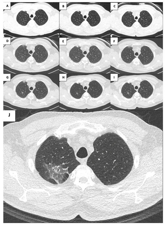Evolution of the right upper lobe lesion throughout the years ((A): 2005; (B): 2009; (C): 2011; (D): 2015; (E): 2016; (F): 2017; (G): 2018; (H): 2019; (I): 2020; (J): 2021).