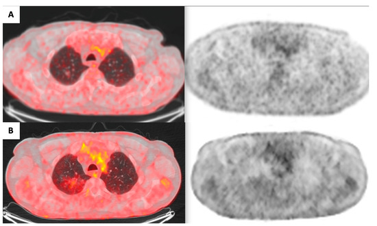 Evolution of FDG uptake within the right upper lobe lesion ((A): 2020; (B): 2021).
