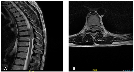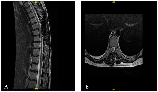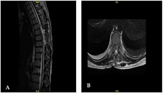 The physical examination and evaluation performed by the neurosurgery service included an imaging study, MRI (5 June 2023), and electrodiagnostic testing (somatosensory evoked potentials and electromyography). The assessments showed the following findings: 1. neuroconduction can be used to study pelvic limbs in normal ranges; 2. somatosensory evoked potential-based study of the pelvic limbs via tibial and peroneal nerves revealed no response on the left side and a slight delay in central conduction time via posterior cords; and 3. electromyography can be carried out without data regarding membrane instability. The magnetic resonance imaging of the thoracic and cervical region revealed an extradural hyperdense lesion at the T6–T8 level, compressing the medullary cord, and myelopathic changes in the spinal cord at the same level; likewise, sensory alteration was identified, with a loss of sensitivity from T10 (Figure 1).