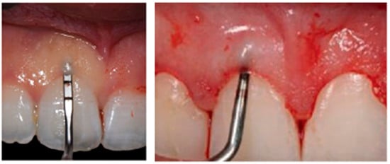 - DeRouck, T.; Eghbaldi, R.; Collys, K.; De Bruyn, H.; Cosyn, J. The gingival biotype revisited: Transparency of the periodontal probe through the gingival margin as a method to discriminate thin from thick gingival. J. Clin. Periodontol. 2009, 36, 428–433. [Google Scholar] [CrossRef]
