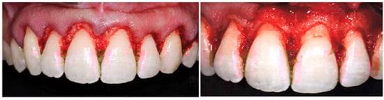 Regarding the laser (Er,Cr: YSGG [erbium, chromium: yttrium–scandium–gallium–garnet; 2780 nm]) used for periodontal surgeries [87], it involves the concept of minimally invasive surgical procedures [88,89]. It is more precise than rotary instruments, causing less collateral and thermal damage to the root surface [90]. It ablates hard and soft tissues with excellent surgical precision and minimal collateral effects. Therefore, precautions should be taken to ensure a safe and efficient osteotomy, such as the use of a specific tip (prism chisel tip) and enhancing the laser parameters that could help in cooling (a short pulse duration [60 μs], fewer pulses [20 Hz], and more water irrigation). The Er,Cr: YSGG laser-assisted surgical procedure can be considered predictable, providing similar outcomes when using a flap or flapless approach.
