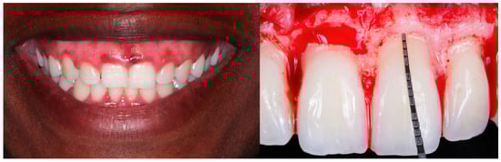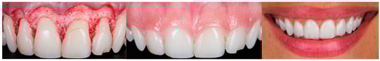 In a natural scenario, the ideal smile exposes a 1 or 2 mm gingival margin, which should present harmony with the upper lip; healthy gingival tissues filling the interproximal spaces; teeth with adequate anatomy, proportions, and color; and a lower lip parallel to the incisal edges of the upper anterior teeth [4,5]. According to the smile’s classification based on the quantity of tooth and gingival tissue exposed in a natural smile, the smile can be classified into three types: low smile (<75% of the upper incisors exposed); medium (75–100% of the anterior teeth exposed together with the interproximal gingiva); and high (100% of the upper incisors and part of the gingival tissue exposed) [6].