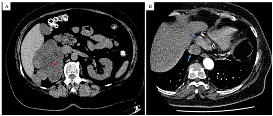 (A) Abdominal CT scan showing a voluminous neoplastic mass involving the right side of the abdomen (10 × 7.5 cm), presumably arising from the right adrenal gland, with liver involvement (*); (B) a cardiac computed tomography angiography (CTA) showing a bilobed, inhomogeneously hypodense mass in the RA, in continuity with the IVC (arrows).