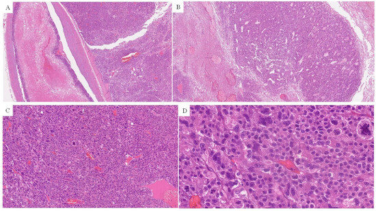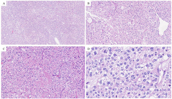(A) The tumor exhibited a nested growth pattern, with nests separated by thin fibrous septa with prominent vasculature, consisting of thin-walled, sometimes dilated, blood vessels; (B) tumor cells showed clear to slightly eosinophilic cytoplasm, and nuclei with moderate atypia and prominent nucleoli; (C) areas of necrosis were found; (D) the tumor showed brisk mitotic activity and some atypical mitotic figures.