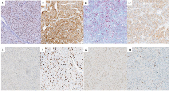 The main differential diagnoses included an ACC and a clear-cell renal cell carcinoma (CC-RCC) with invasion of both the adrenal gland and the IVC, extending into the RA. Immunohistochemical analysis was therefore performed as previously described [18], and the antibodies tested included SF1, PAX8, CD10, inhibin, Melan-A, chromogranin A, synaptophysin, and Ki67. Immunohistochemical analyses for the p53, β-catenin, and “mismatch repair” (MMR) proteins were also performed. The tumor showed immunoreactivity to SF1, inhibin, Melan-A, chromogranin A, and synaptophysin, with a Ki67 > 50%, whereas PAX8 and CD10 were negative (Figure 3). Accordingly, a diagnosis of metastatic adrenal cortical carcinoma (ACC) was finally rendered.