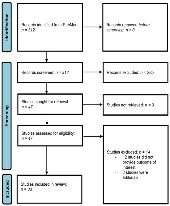 The systematic literature search using the above inclusion and exclusion criteria resulted in a total of 312 primary records. After title and abstract screening, 262 of the primary records were excluded. Of the remaining 47 studies [11,12,13,14,15,16,17,18,19,20,21,22,23,24,25,26,27,28,29,30,31,32,33,34,35,36,37,38,39,40,41,42,43,44,45,46,47,48,49,50,51,52,53,54,55,56,57], 15 were excluded after full-text analysis. These 14 studies [44,45,46,47,48,49,50,51,52,53,54,55,56,57] were excluded for the following reasons: (1) 12 studies [44,45,46,48,49,50,51,52,53,54,55,57] did not have their primary focus on hip surgery and did not provide relevant clinical evidence on hip surgery, (2) 2 studies [47,56] were editorials. Finally, a total of 33 primary studies were included in this narrative review [11,12,13,14,15,16,17,18,19,20,21,22,23,24,25,26,27,28,29,30,31,32,33,34,35,36,37,38,39,40,41,42,43]. The process of the literature search is illustrated in Figure 1.