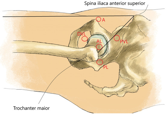 Arthroscopic portals to the hip joint. A: anterior portal; AL: anterolateral portal; DVL: distal ventrolateral portal; PL: posterolateral portal; PVL: proximal ventrolateral portal.