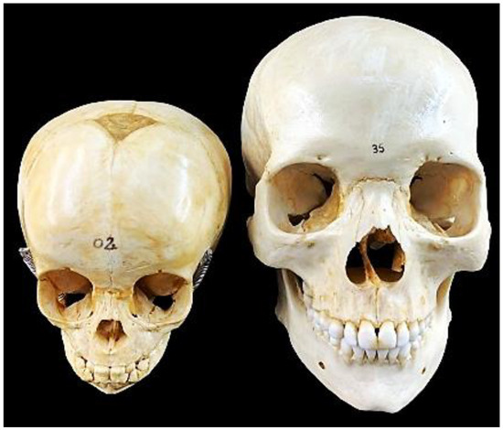 Comparison of infant and adult skull anatomy. The left image shows an infant skull (younger than 2 years old, around 18 months old) with smaller bones, deciduous teeth, a prominent frontal bone, and open sutures and fontanels. The right image shows an adult skull (around 35 years old) with thicker bones, permanent teeth, a more prominent zygomatic bone, closed sutures, and a more projecting mandible. The image was taken in the Didactic Anatomy Laboratory at the School of Dentistry, Aracatuba.