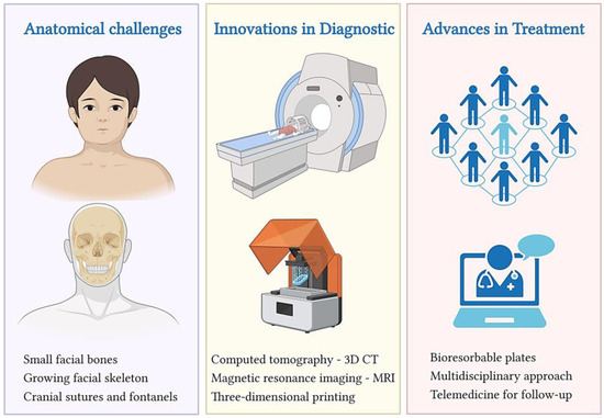 Therefore, this narrative review aims to examine the key anatomical challenges and innovative solutions in diagnosing and treating pediatric facial fractures. The article focuses on recent advancements in diagnostic tools, surgical techniques, and the role of interdisciplinary care, which are essential to addressing the complexities of pediatric trauma. Special attention is given to innovations such as three-dimensional imaging technologies, virtual surgical planning, and the use of bioresorbable materials, all of which have improved diagnostic accuracy and surgical precision. Additionally, the increasing use of minimally invasive techniques is highlighted, as these allow for reduced trauma and quicker recovery, both of which are especially beneficial in pediatric populations. Finally, the review emphasizes the importance of collaborative care and future perspectives in managing the comprehensive needs of pediatric patients with facial fractures.