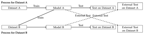 Figure 1 presents a schematic that visualizes the cross-testing approach used to evaluate the generalization capability of deep learning models. In this approach, models are trained and tested on their own datasets and then externally tested on another dataset. Specifically, Dataset A is used to train Model A, which is first tested on Dataset A itself and then externally tested on Dataset B. Conversely, Model B is created by using Model A and further training it on Dataset B, after which it is initially tested on Dataset B and subsequently tested on Dataset A. In the visual representation, solid arrows indicate the standard training and testing flow on the same dataset, while dashed arrows depict the external testing of the models on the other dataset. This training schematic was only applied to deep learning models using the Keras architecture. This diagram effectively illustrates how evaluating models on both their training data and external data helps assess their ability to generalize beyond the data on which they were trained.