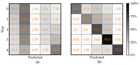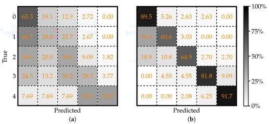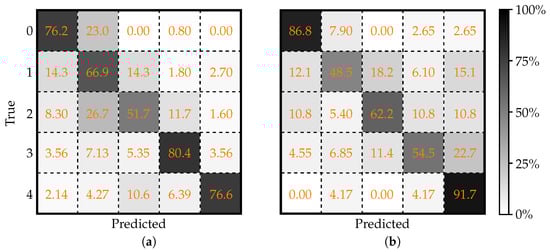 (a) Trained on A, tested on B; (b) Trained on B, tested on A. Confusion matrices illustrating the cross-dataset evaluation of the deep learning model for a 5-class classification problem using the Keras framework. (a) Model trained on Dataset A and tested on Dataset B; (b) Model trained on Dataset B and tested on Dataset A.