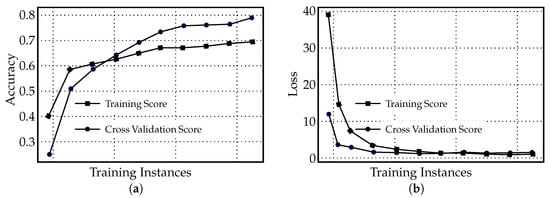 (a) Accuracy; (b) loss. Learning curves for accuracy and loss returned by the deep learning model using the Keras framework trained on the Dataset A.
