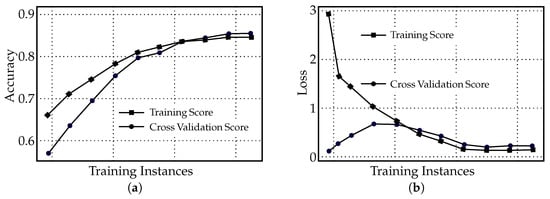 (a) Accuracy; (b) loss. Learning curves for accuracy and loss returned by the deep learning model using the Keras framework trained on Dataset B.