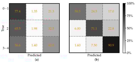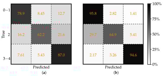 (a) SVM—linear kernel; (b) Keras framework. Two confusion matrices, evaluated on Dataset B, illustrating the performance of the SVM model (a) and Keras framework (b) in classifying knee X-ray images. Each matrix shows the true classifications (rows) versus the predicted classifications (columns).