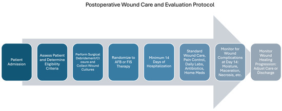 Subjects stayed in the hospital or a step-down facility for at least 14 days after their final surgery (Figure 1). The 14-day time point was selected based on studies demonstrating significant changes in the inflammatory environment and protease activity during this stage of healing, marking the transition from the inflammatory phase to the proliferative phase [14]. After closure, subjects were randomly assigned to receive AFB or FIS therapy for 14 days, regardless of hospital stay length. Closure success and complications were documented during this time. The study then followed patients monthly for 365 +/− 20 days to assess complications and the need for additional treatments. While in the hospital, standard-of-care interventions (wound dressings, topical treatments, and adjunctive therapies like vacuum-assisted closure) were carried out. The principal investigator decided if additional surgical debridement was necessary based on injury appearance and culture results. If a flap failed postoperatively, the subject was removed from the study and switched to standard wound care. Given that all participants were hospitalized for a minimum of 14 days post-surgery, they were also monitored during the 14-day post-closure period for the assessment of wound complications, including moisture, maceration, drainage, dehiscence, epidermolysis, necrosis, and demarcation. Postoperative care included standard wound care protocols, pain management, daily laboratory monitoring, and antibiotics tailored to culture results. The appropriate continuation of home medications, which varied per patient, was also provided. Additionally, follow-up evaluations were conducted at one month, six months, and one year after closure to determine the status of the wound, as reported in medical records, and self-reported by the subjects.